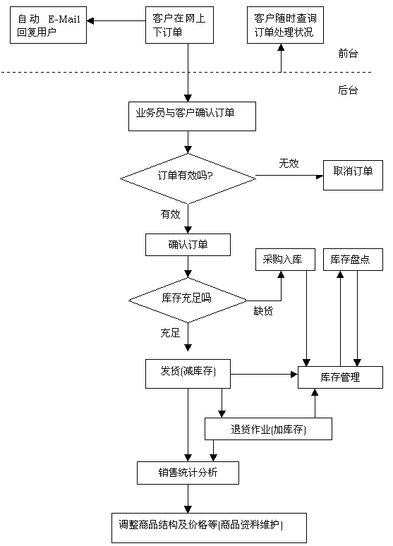 系统提供定单管理、发货管理、退货管理、库存管理等完备的销售管理流程。库存管理包括货物进出库、库存过多/过少报警、库存时间过长报警、对供货商的应付款(代销或订金方式向供货商进货)等。当用户下完定单后,系统将立即自动向销售人员发出定单通知信,并更新定单库内容,操作人员根据定单执行情况随时更新定单库内容。系统根据定单库内容和库存内容提供动态查询功能,供管理人员随时掌握销售及库存情况。
