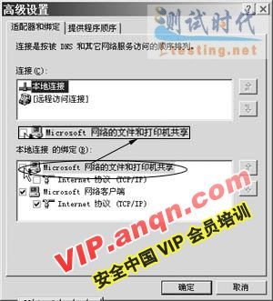 当然,对于文件和打印共享服务的137、138、139和445端口,还可以采用以下的方法来关闭。鼠标右击“网络邻居”,选择“属性”,选择“网络和拨号连接”对话框的“高级”菜单,选择“高级设置”命令,进入高级设置对话框(如图3),在出现的画面中的上部选择所需的连接,下部取消“文件和打印机共享”项(保持空选),即可禁止这几个端口。