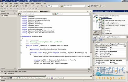 AppScan DE(AppScan 开发版)可以作为多种平台的插件,这些平台包括 Eclipse、WebSphere、Visual Studio、JBuilder,协助开发人员对编写的模块进行自我安全诊断。图 2是 AppScan DE 作为 Visual Studio 插件使用的示例。