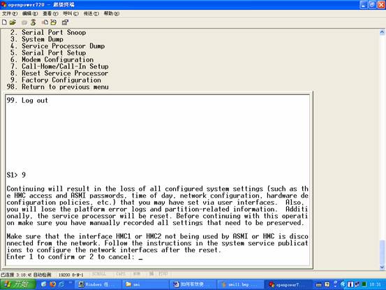 SMI是系统管理接口(System Management Interface),ASMI是高级系统管理接口(Advanced System Management Interface)。你可以用普通网线直接把你的PC机的以太网口与OpenPower720的HMC1或者HMC2接口相连,就可以得到ASMI的界面了。如果你用交叉的串口线连接PC机的串口和OpenPower720的串口1,你可以得到SMI界面(System Management Interface)。ASMI和SMI的系统设置选项几乎是一致的,只是ASMI是基于浏览器的界面,而SMI是字符界面。