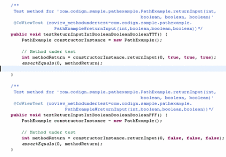 在以上示例中, returnInput() 具有七个分支——三个是真,三个是假,还有一个是用于方法输入的隐藏分支。您可以用两个测试用例来覆盖六个真和假的分支: