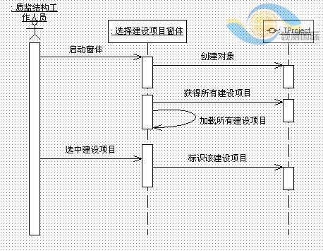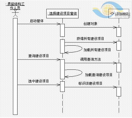 图5 所示的顺序图,是“选择建设项目”用例的基本流中对象之间的交互序列。在此顺序图中的对象有质监机构的工作人员、选择建设项目窗体的一个实例、 TProject类的一个对象。用户激活选择建设项目窗体的一个实例。该窗体创建TProject类的一个对象。接着窗体调用对象方法,获得的所有建设项 目,并且调用自身的方法将这些建设项目进行加载,供质监机构的工作人员选择。用户选择了一个建设项目,窗体调用对象的方法将用户选择的建设项目标识为当前 的建设项目,以后所有的操作将在这个建设项目上进行。