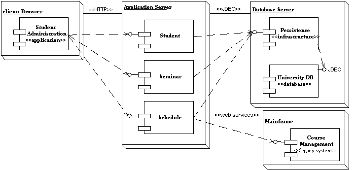 图1是一个大学管理系统的UML部署图描述. 该图描述了那些包含单一应用程序的主要软件组件是怎样配置到生产环境中的,这使得项目团队能够确定他们的部署策略。
