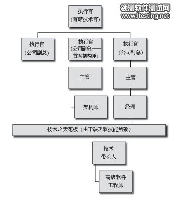 吃技术饭的人无疑是很有才能的,他的问题在于总需要单位中有人牵头才会向前迈动一步。如果经理或主管打算利用某个机会让这个“有才能”的人参加某个会议,执行官却在会上被嘲讽,那么执行官对这种人的第一印象就会是负面的,可能要经历数年才能摆脱这种糟糕的第一印象。经理会由衷地后悔给予他的这个机会,而且不想重复类似事件。于是,有技术才能的人的升职天花板变得更厚了(如图1所示)。