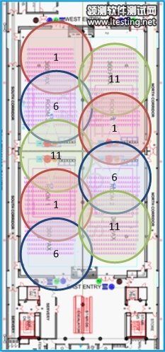 下一步就是分配信道。由于国内只能用2.4GHz的频段,这个频段虽然号称有11个信道(有的国家有13个),实际上只有1,6,11三个互相不重叠的信道可以用。把这三个信道尽可能互不重叠地在上图中覆盖起来(见上图)。有时候如果无法做到不重叠地覆盖,那么还要考虑用扇区天线把覆盖区域细分成几个扇区。