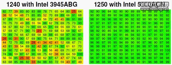 信道分配完成后就要实地部署无线网络了(实际上在上述理论工作之前就应该做实地勘探,考虑墙壁和各种反射物的影响,此处为了简化略去)。部署时应该考虑用高增益天线,但是降低每个AP的发射功率,让其覆盖区域基本与规划的区域吻合。注意这里功率不是越大越好,应该让每个AP只覆盖规划好的区域,别越俎代庖。部署时可能需要用一些现场测量工具对于部署的效果进行评价,防止由于多径干扰出现死角。下图就是用11g部署和11n网络部署后整片区域的差异。红色区域表示覆盖不理想的情况,可以看出 11n网络对于多径干扰抑制非常好。再过几年尽量就不要考虑兼容问题,部署时不要开启11g模式了。目前看起来还是需要通过11g接入点自身功率和天线调整,甚至增加额外接入点来弥补。