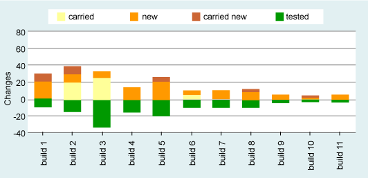 图 6 中还说明了效率,这显示出更少量的从一次构建到下一次的未测试的或“带过来的”变更。通过在引入了缺陷的构建中找到这些缺陷,可以尽可能低成本地进行确定,并且减少了相互依赖的缺陷修复的复杂链的风险。对一次构建启动测试,并在随后的构建中偿还债务的方法,只要在后继的构建中相同的功能没有变更时都会有效。