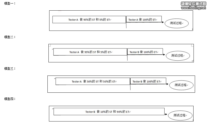 从模型的演变过程可以看到,其实我们最终目标是没有ST tester和ET tester之分的,所有人都是标准的ET tester。国外ET的大师们确实带了好几个ET team,在项目测试过程中已经达到了模型四的境界,可想ET是可以主导整个项目测试的,其进度控制和质量管理都在实践中有了自己方法。