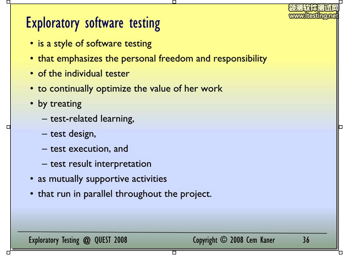 探索式测试有丰富的内涵,Kaner博士用一页幻灯片的篇幅介绍了探索式测试的核心。