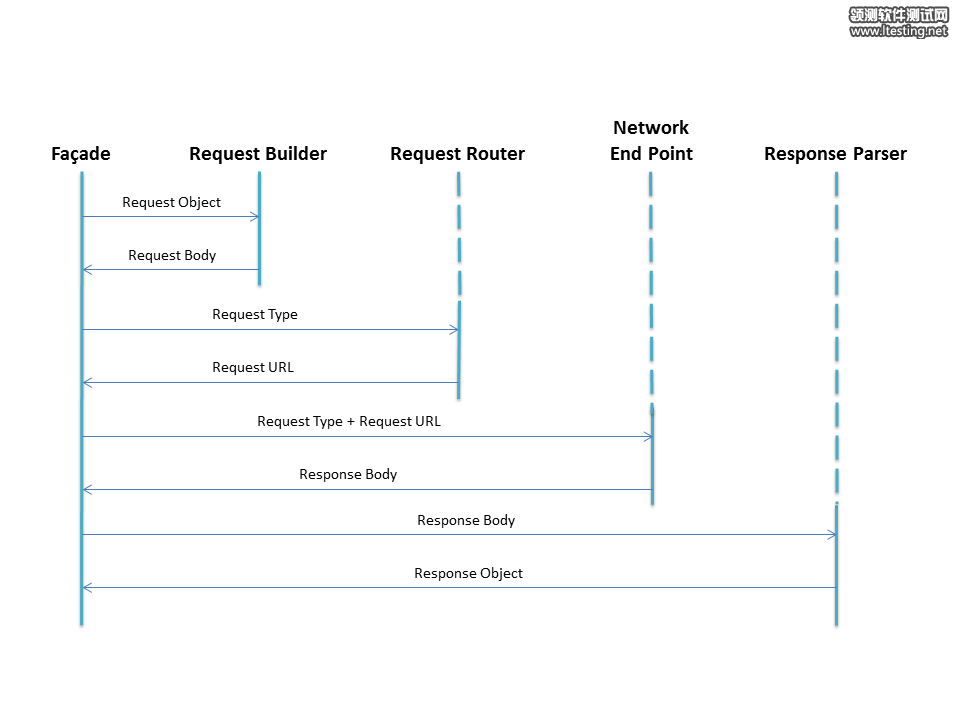 用面向对象的语言来集成一个基于HTTP的服务,集成点的设计经常会出现这样一个模式,其中涉及五个主要的组成部分:门面(Façade);请求构造器(Request Builder);请求路由器(Request Router);网络端点(Network End Point);应答解析器(Response Parser)。它们之间的交互关系如下图: