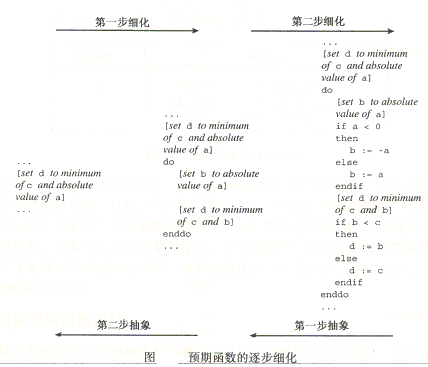 图1同时也表现了与已得到程序函为目的而解读控制结构有关的两步抽象。抽象后的程序函数和最初的预期函数应一样。尽管这个简单的例子从控制结构上就可以理解,但是在相对较大的设计院里,预期函数在验证和维护上对保证设计意图则发挥了至关重要的作用。对仅仅5-10行的语句可以一目了然,但对50或100行就不那么容易了。很明显在预期函数对保证控制结构细化的正确性是很重要的。后面详述。