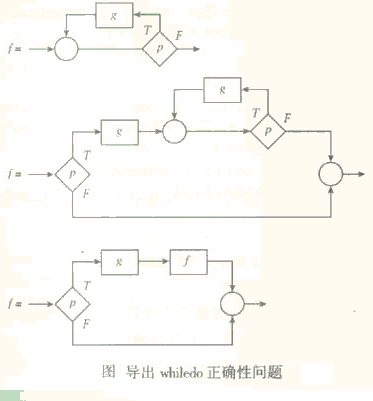 循环结构的正确性难以直接证明.不过,可通过验证一个等价的相对简单的ifthenelse结构来完成对一个可终止的循环的正确性检验,这种ifrhenelse结构是通过对循环的执行路径的变换而得到的.例如,考虑在图4.5的第一个以图形形式显示的whiledo结构.在图下的第二个图的中间,创建了一个等价的ifthenelse,其中用whiletest(p)作为断言.对ifthenelse的真分支,先执行g ,然后是whiledo结构,和原来的whiledo的执行一样.对假分支,什么也不做.也和原来的whiledo的执行一样.因此,这个新ifthenelse结构和上面的whiledo结构是等价的.但我们要求真分支上的whiledo结构与?等价,因此将它替换为?,得到图4.5的第三个图的结构.这样,whiledo的正确性问题就变成了ifrhenelse和顺序结构的正确性问题.通过分析irthenelse的执行就可以解决whiledo的正确性问题.真路径要求g和其后的?必须执行?,假路径是空操作执行?.