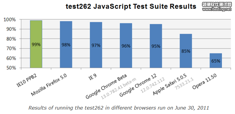 微软第一时间在主流浏览器上运行了这些测试。测试结果显示,IE 10 PPB2通过了99%的测试,紧随其后的是FireFox 5和Chrome,Opera仅仅通过了65%的测试,在JavaScript实现上仍然落后于标准: