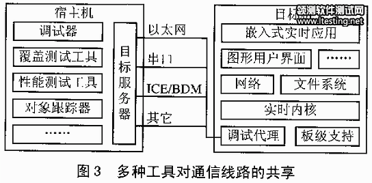 嵌入式应用程序的开发通常采用交叉开发方式,几乎所有的开发工具均要解决3部分的问题:宿主机部分的功能、目标机部分的功能、宿主机与目标机的连接问题。其中,宿主机与目标机的连接是个瓶颈,如果不同的工具要使用同一物理线路实现数据传输,则要解决对该物理线路(或者说硬件端口)的正确共享。比如在图3所示的环境中,宿主机方的各种工具通过统一的接口——目标服务器(target server)实现对通信线路的访问,目标机方的调试代理(debug agent)则是各种信息(调试信息、覆盖信息、时间信息、对象信息等)的收集与传递的核心。