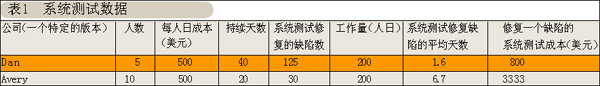 因为Avery的项目查找缺陷比修复缺陷花费了更多的时间,所以Avery有高的系统测试成本。虽然如此,Avery这个较大的项目的总缺陷修复成本比Dan这个较小的项目低。并且Avery的修复缺陷的版本发布成本比Dan的项目低许多。