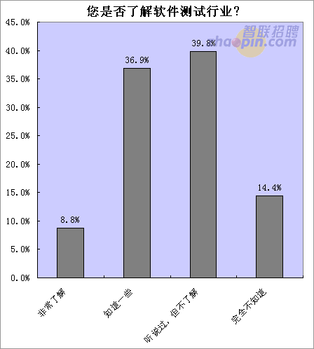 调查显示,职场人对于软件测试行业认知度一般。选择非常了解的只有8.8%,可见,对于该行业了解程度高的职场人不足一成。选择“知道一些”的不足四成,其余超过半数的职场人都选择不了解甚至没听说过。可见,软件测试行业作为一个新兴行业还没有受到广泛的社会认知,还有很多职场人对于这一行业不甚了解。