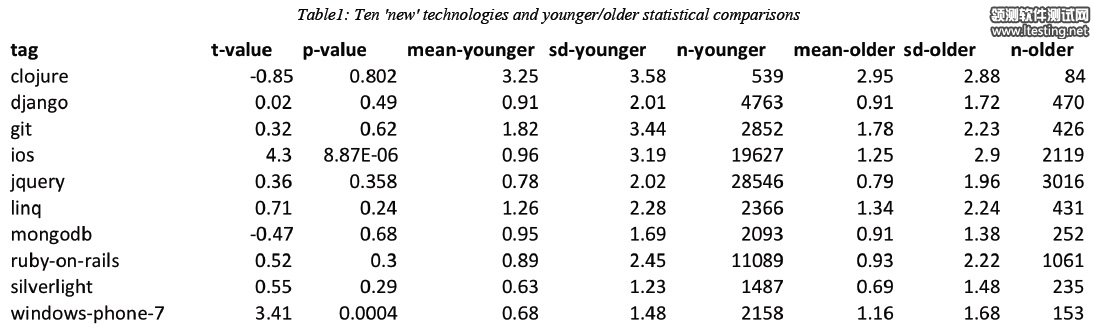 论文的作者分析了Tag,用了最近5年内比较流行的技术Tag,然后用了一套比较严谨的算法来查看那些所谓的“老程序员”是否在新技术上跟上不了,所谓跟不上,也就是这些老的程序员在回答这些新技术上并不活跃。所谓老,就是37岁以上的程序员(就是我现在的年纪)。