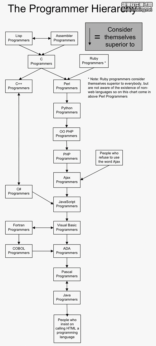 程序员是否可以以它熟悉的语言判断高下?国外某程序员对此表示认可,并绘出了一张有趣的有关于程序员的图像,箭头的意思是表示某语言的程序员比另一语言的程序员更高级。最高阶自然是神级Lisp和汇编语言,最后一个嘛,自己看吧。