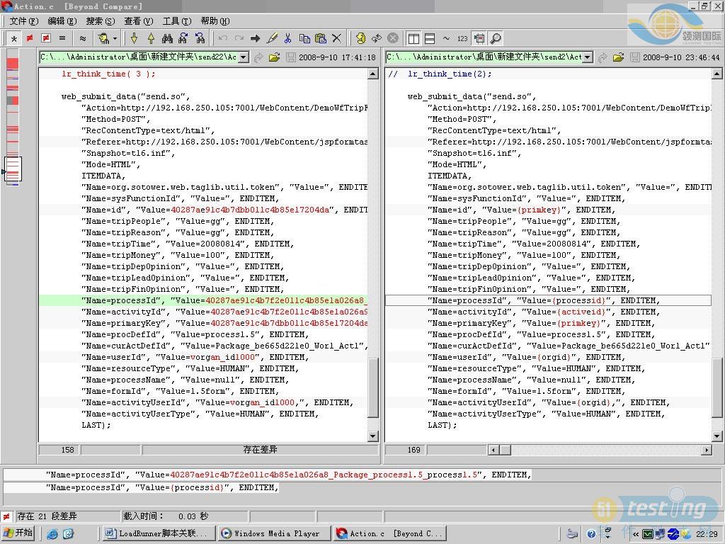 执行同样的操作,先后录制两次脚本保存,比较一下生成的Action.c,注意动态数据不能放在vuser_init.c文件中。自带的WinDiff工具不好使用,推荐使用Beyond Compare工具。不是所有的差异处都要关联的,WEB_URL()等方法的参数列表的先后顺序是没关系的,思考时间当然也可以不同。下图中右边的脚本已经关联过动态数据了,如果是刚录制的两份脚本,右边的id、processId等也是32位的主键,左右两份脚本的差异一目了然,记下这些动态数据的值。