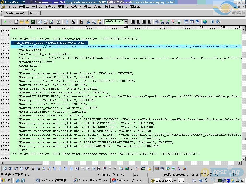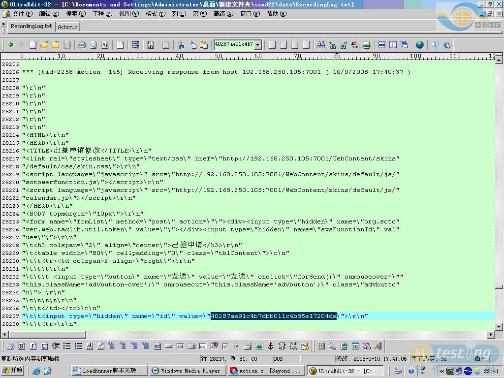 以左图id的值:40287ae91c4b7dbb011c4b85e17204da为例,在脚本\data\RecordingLog.txt中查找该值。找其第一次出现的地方,一般在该值的上方会有这样的字样:*** [tid=2258 Action 145] Receiving response from host 192.168.250.105:7001 ( 10/9/2008 17:40:37 )。如下图,记下40287ae91c4b7dbb011c4b85e17204da的左边界:<input type=\"hidden\" name=\"id\" value=\"和右边界:\">。注意看一下这样的左右边界是否唯一。