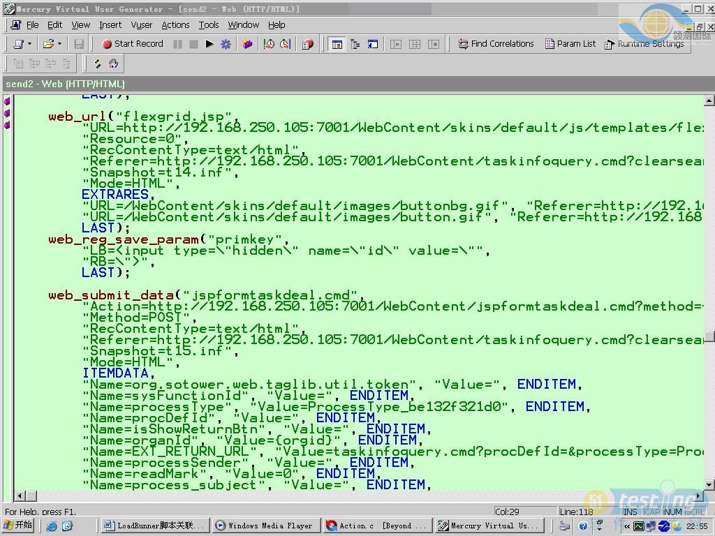 该字样的下面紧接着是方法web_submit_data("jspformtaskdeal.cmd",……),这个方法在Action.c中是同样存在的,通过这个方法我们可以知道在Action.c的什么地方插入web_reg_save_param()方法。现在我们需要做的就是在脚本Action.c中,方法web_submit_data("jspformtaskdeal.cmd",……)的前面,紧挨着这个方法写上web_reg_save_param()方法用于保存动态数据,其中LB、RB分别是刚才记录下的左右边界值,primary是我们起的变量名字。完整的方法如下: