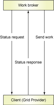 分发系统惟一的问题是实现难度比较大。这种模型不是由服务器运行 Web 服务系统,客户机作为 Web 服务的客户机,而是调了个头。网格提供者(通常应该是“客户机”)需要支持一个 Web 服务的服务器接口。这时,代理(通常是“服务器”)成为网格提供者的 Web 服务客户机。您可以从图 2 中看到这种模型的运行情况: