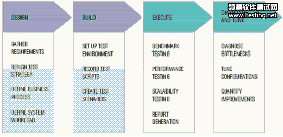 一些已经成功实行自动化性能测试的组织,已经将这个过程分解为独立的阶段。虽然具体的实施可能有所不同,但是,宽泛地说,性能测试可以分为四个阶段—设计,构建,执行和诊断/调整。每个阶段有具体的任务,涉及到不同的角色,这些任务在转到下一阶段前必须完成。在最高级别,四个阶段可以被描述如下:
