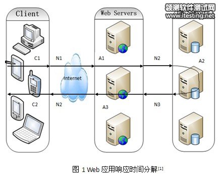 其中C1是用户发请求前在客户端完成预处理阶段;C2是客户端接收到服务器返响应后,对处理结果展现的阶段;A1是WEB Server或者APP Server对请求进行处理阶段;A2是数据库服务器对请求进行处理阶段;A3是WEB Server或者APP Server对DB Server 返回结果进行处理的阶段;N1是请求由客户端发出并达到Web/App Server 的阶段;N2是如果需要进行数据库相关的操作,由Web/App Server 将请求发送至DB Server 阶段;N3是DB Server 完成处理并将结果返回Web/App Server 阶段;N4是Web/App Server 完成处理并将结果返回给客户端阶段。