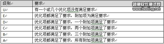 其中,优化项所有内容必须满足,附加项可以不满足,在评测结果中Y代表满足、N代表不满足、Null代表无优化项相关技术。评测结果共分为A、B、C、D、E和U六个级别。具体对应关系如下表所示: