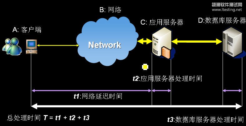 这个图源于小布老师的视频中,比较直观、简洁地反映了一个应用系统的运行过程,其中包括客户端、网络、应用服务器和数据库服务器,其中每一个环节都是在执行性能测试分析中必不可少的元素,结构图中也合理得分析出了响应时间的处理过程,当请求从客户端发出之后到最后返回到客户端,这个过程中每一个环节的处理都有可能最后成为系统运行中的性能瓶颈,所以可见对系统整体结构的理解是何等重要。