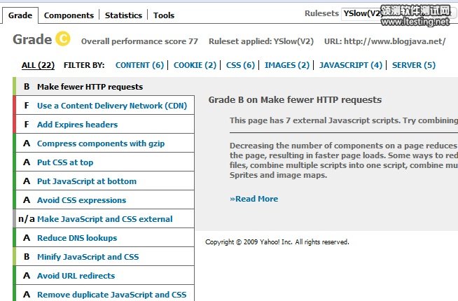 yslow跟pge speed一样是基于 firefox\\firebug的插件,功能与page speed类似,对各种影响网站性能的因素进行评分,yslow是yahoo的工具,本人也一直在使用,推荐一下。