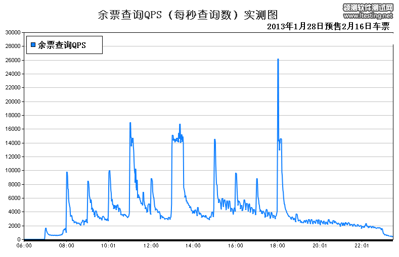 根据系统运行数据记录,技术改造之后,在只采用10几台X86服务器实现了以前数十台小型机的余票计算和查询能力,单次查询的最长时间从之前的15秒左右下降到0.2秒以下,缩短了75倍以上。2012年春运的极端高流量并发情况下,系统几近瘫痪。而在改造之后,支持每秒上万次的并发查询,高峰期间达到2.6万个查询/秒吞吐量,整个系统效率显著提高。如上图所示。