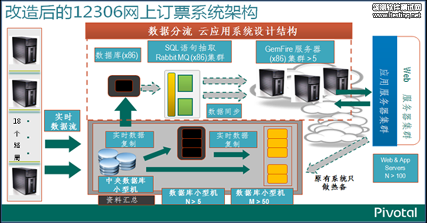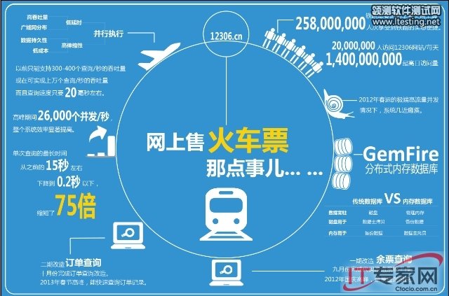 2012年3月开始,铁路总公司(原铁道部)开始调研、改造12306。2012年6月选择了Pivotal GemFire分布式内存计算平台(Distributed In-memory computing)改造12306,由铁科院项目小组负责人王明哲主任和资拓宏宇(IISI)信息科技有限公司在铁科院主管朱建生所长领导下提供技术实施。一期先改造12306的主要瓶颈——余票查询系统。9月份完成代码改造,系统上线。2012年国庆,又是网上订票高峰期间,大家可以显著发现,可以登录12306,虽然还是很难订票,但是查询余票很快。2012年10月份,二期用GemFire改造订单查询系统(客户查询自己的订单记录)。2013年春节,又是网上订票高峰期间,大家可以显著发现,可以登录12306,虽然还是很难订票,但是查询余票很快,而且查询自己的订票和下订单也很快。