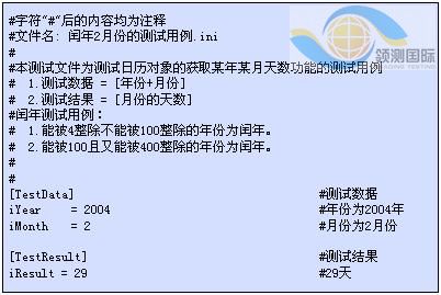 当每个测试用例对应的测试结果都一样时可以将测试结果嵌入到测试代码中,当不同的测试用例要对应不同的测试结果时,根据1)中论述应该将测试结果也从测试代码中分离出来。为了不混淆测试数据和测试结果之间的关系,将它们放在同一个文件中。这里举个例子,图1-2中的“闰年2月份的测试用例.ini”文件中内容如图1-3: