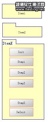 我们的自动测试软件无论是真的硬件性能的测试或者真的软件功能模块稳健性的测试,对我们来说都可以把她抽象成一个个独立功能的Item(Process或者function),在每一项item里又会有其特定的执行过程,我们可以将这个过程抽象出一个个step,当然这些step对我们来说都是表象的step,没必要去考虑每个step具体的运行环境和执行流程,画个图吧: