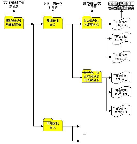 当一个功能有很多组测试数据时,我们可以将测试用例数据全部存放在文件中,使测试用例和测试代码分离开。由于测试用例脱离测试代码而存在,可以很方便的进行管理和维护。我们可以为每个要测试的函数(或功能)建个目录,每个测试用例放在一个单独的文本文件中,将所有对应于该函数的测试数据文件全部放入该目录下,当测试数据量很大时还可以在目录下再创建相应的子目录,分类进行管理。这样可以方便测试用例的管理,而测试程序也只用专注于测试逻辑。还以测试周期会议预约功能的例子为基础进行讨论。