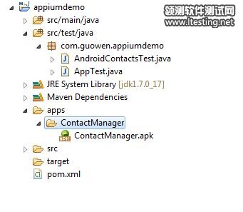 5. 编写Test,使用ADT安装好Maven插件,创建一个Maven项目,添加一个文件夹apps用来存放被测的app,这里测试的是ContactManager.apk