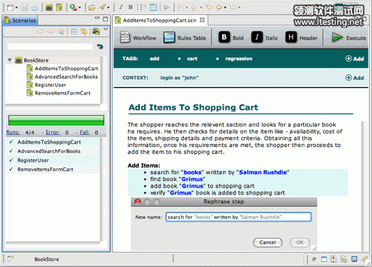 写单元测试已经成为不争的事实,自不必说。另外,由于Cruise与很多版本管理软件打交道,这里所说的End2End测试是指与这些外部接口的测试。而功能测试是指将Cruise Server和Agent真正在测试机器上运行起来后,再运行TWIST自动化测试套件。我们对功能测试的原则就是每个Story都要有功能测试覆盖,QA与开发人员共用编写功能测试用例,由开发人员实现之,而且功能测试要让真实的Cruise Server和Agent进行通信的基础上进行。TWIST是我们公司的另一款产品,用于自动化功能测试,其测试编辑界面如下所示: