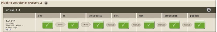 目前Cruise的研发环境中,有一个被称为“UAT(User Acceptance Testing)”的测试环境,目前它由一台Cruise Server和近20台Agent组成,用于Cruise团队自身的持续集成与部署管理。还有另一个被称为“Production”的预发布生产环境,它由一台Cruise Server和近70台Agent组成,由多个项目组同时使用。“Production”环境是真实的生产环境,部署失败,就意味着损失。因此,虽然部署工作可以通过自动化脚本完成,但我们还是在“UAT”和“Production”两个Stage之前加上了人工开关(manual approval),如下图所示。前三个Stage全部是自动触发,其后全部为手工触发。每个待发布的版本都会先被部署到UAT环境中,实际上也就做了试 运行,如果该版本稳定,则部署到“Production”环境中。这样就使部署风险尽在掌控之中。