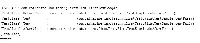 这个清单1中doBeforeTests()方法,在任何一个test方法调用之前被调用一次。doAfterTests,就是所有的test方法运行过了以后再调用一次。从Console输出的信息中,我们可以验证这一点: