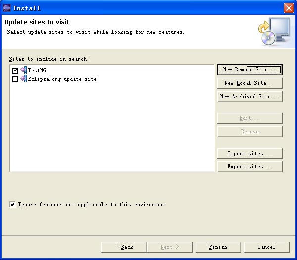 在Eclipse中安装testNG很简单。和安装其他的plugin的方法相似。首先启动Eclipse3.1,在Help->Software Update->Find and Install, 在弹出的向导中,选择"Search New Features to Install", 点击"New Remote Site",如图1所示。在URL中输入 http://beust.com/eclipse,点击"OK"。如图2所示,点击"Finish",Eclipse会帮助你完成下面的安装。熟悉Eclipse的读者对这个过程一定不会觉得陌生。