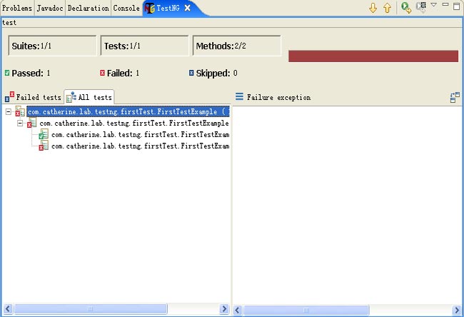 注意:TestNG的视图的作用时为了现实测试结果。为了显示视图的功能,图3的视图是运行了一个测试用例后的结果。读者如果是第一次打开视图,应该是空白的。