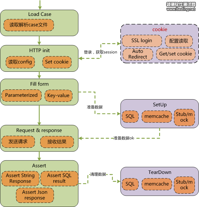 itest功能组成与基本处理流程如下图,以主要协议HTTP为例: