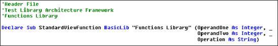 为了演示这种框架的应用,我将自动化同上的测试用例,但使用了一个SQABasic的库文件。这个库文件包括执行操作的一个函数。以下是头文件(header file (.sbh))和库文件(library source file (.sbl))。