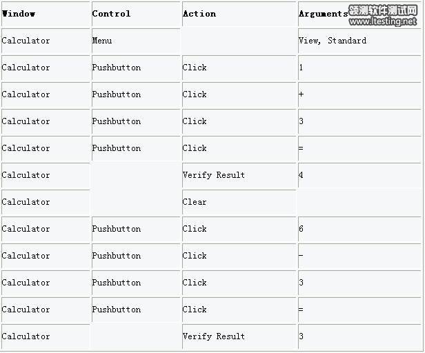 如果要映射出手工测试Windows计算器功能过程中用鼠标执行的操作,我们可以创建如下的表格。” Window”一列包含了我们执行鼠标操作的应用程序窗口的名字(在这个例子中,他们都发生在计算器窗口里)。” Control”一列指出了鼠标点击的控制键的类型。” Action” 一列列出了鼠标的操作(或是测试人员的)。”Arguments”列指出了特定的控制键(1, 2, 3, 5, +, -等)