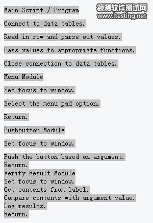 这个表格代表了一个完整的测试,为了表示一系列测试可以根据需要增加。一旦你创建了数据表,你就可以简单地编写用来读取每一个步骤的程序或脚本集,基于Action字段中的关键字执行步骤,完成错误检查,然后记录任何相关的信息。这种程序或脚本集看上去象下面的伪代码: