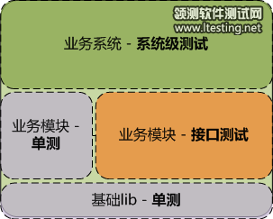 在业务模块的分层测试中,各种测试方式的比重如下图所示,实践中我们从系统级测试发现的bug数目最多,所以系统级测试占比比较大;除此之外,由于现在敏 捷的尝试以及普遍开展的项目迭代,面向模块提前介入测试的方式也越来越频繁,而此时并不具备系统级可测性,因此模块的接口就成为测试自动化的最好入口。