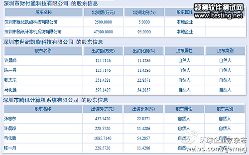 据《环球企业家》报道,财付通的股东为深圳市世纪凯旋科技有限公司和深圳市腾讯计算机系统有限公司。