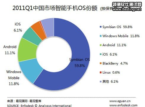 图为2011年第一季度中国市场智能手机OS份额