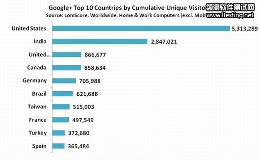 市场研究机构comScore发布的数据显示,Google+在推出后21天内用户人数突破2000万。如上图所示,美国用户占绝大部分,印度市场的表现也很显眼。从上图可以看出,Google+海外市场表现同国内表现一样有力。